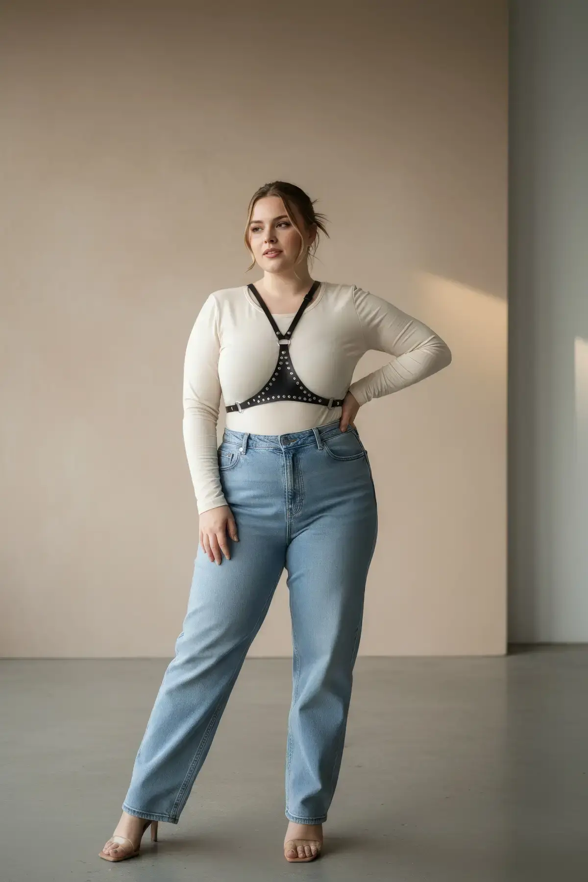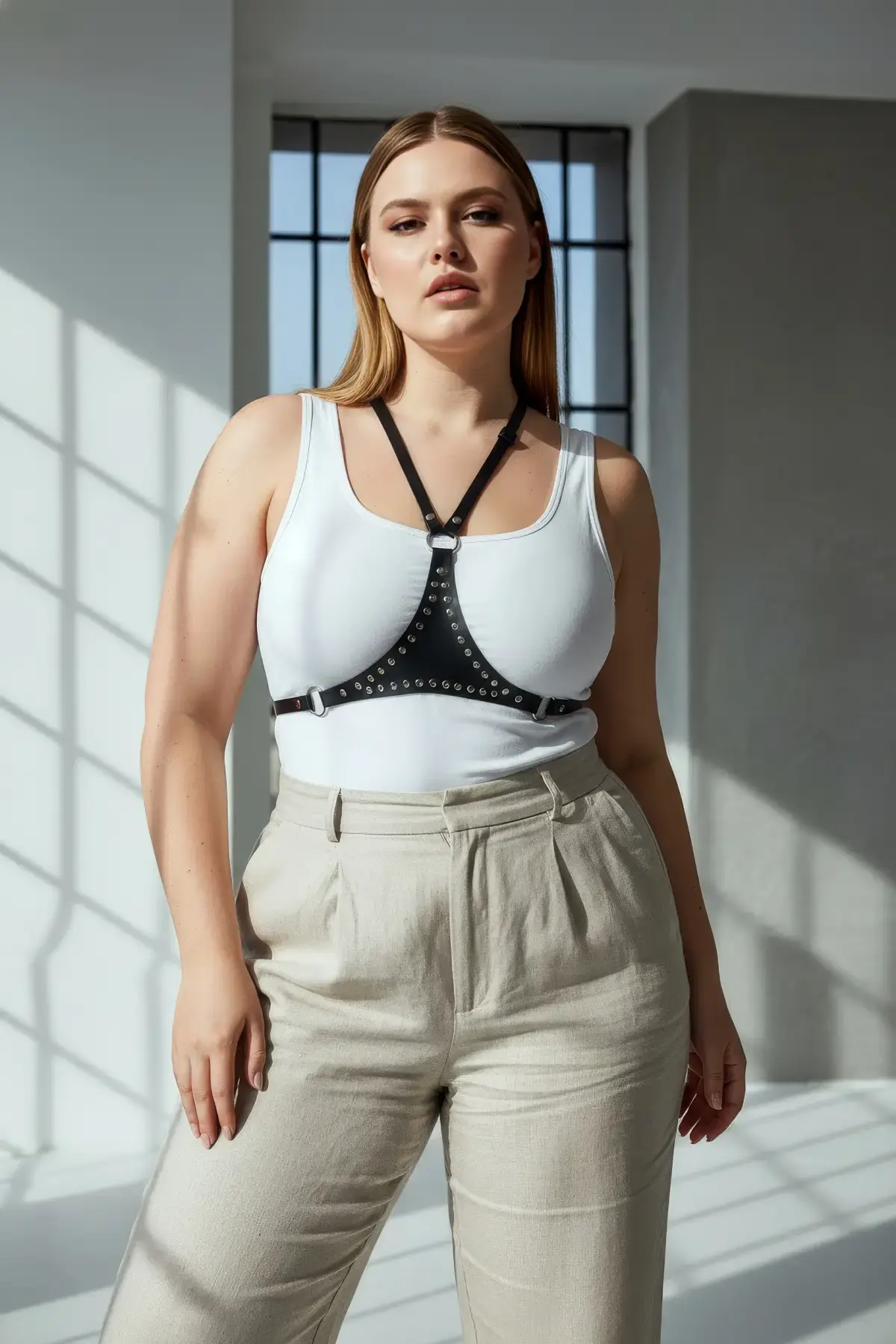Büyük Beden Siyah Kadın Kemer Zımbalı Deri Vücut Harness Aksesuarı - APFT850