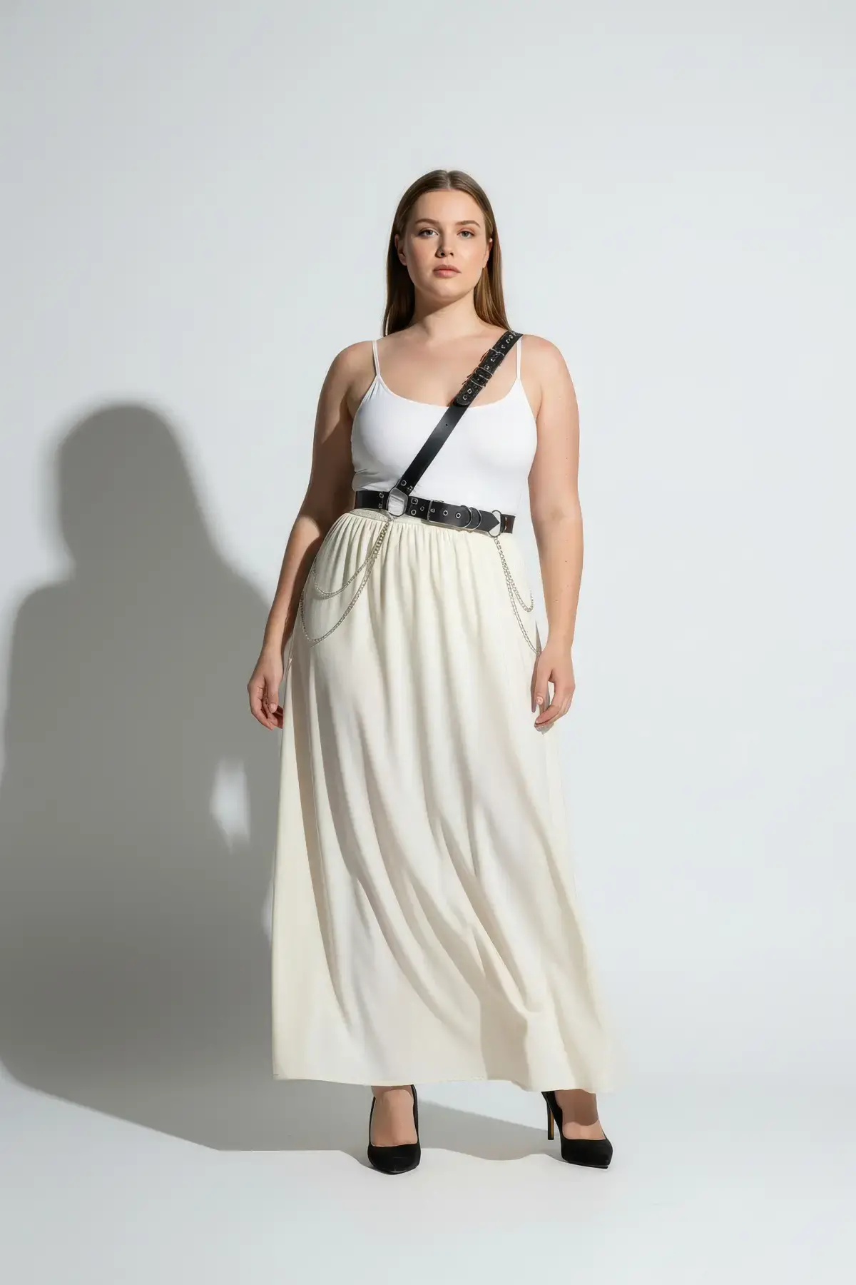 Büyük Beden Siyah Kadın Kemer Zincir Detaylı Body Harness Stil Vücut Aksesuarı - APFT813