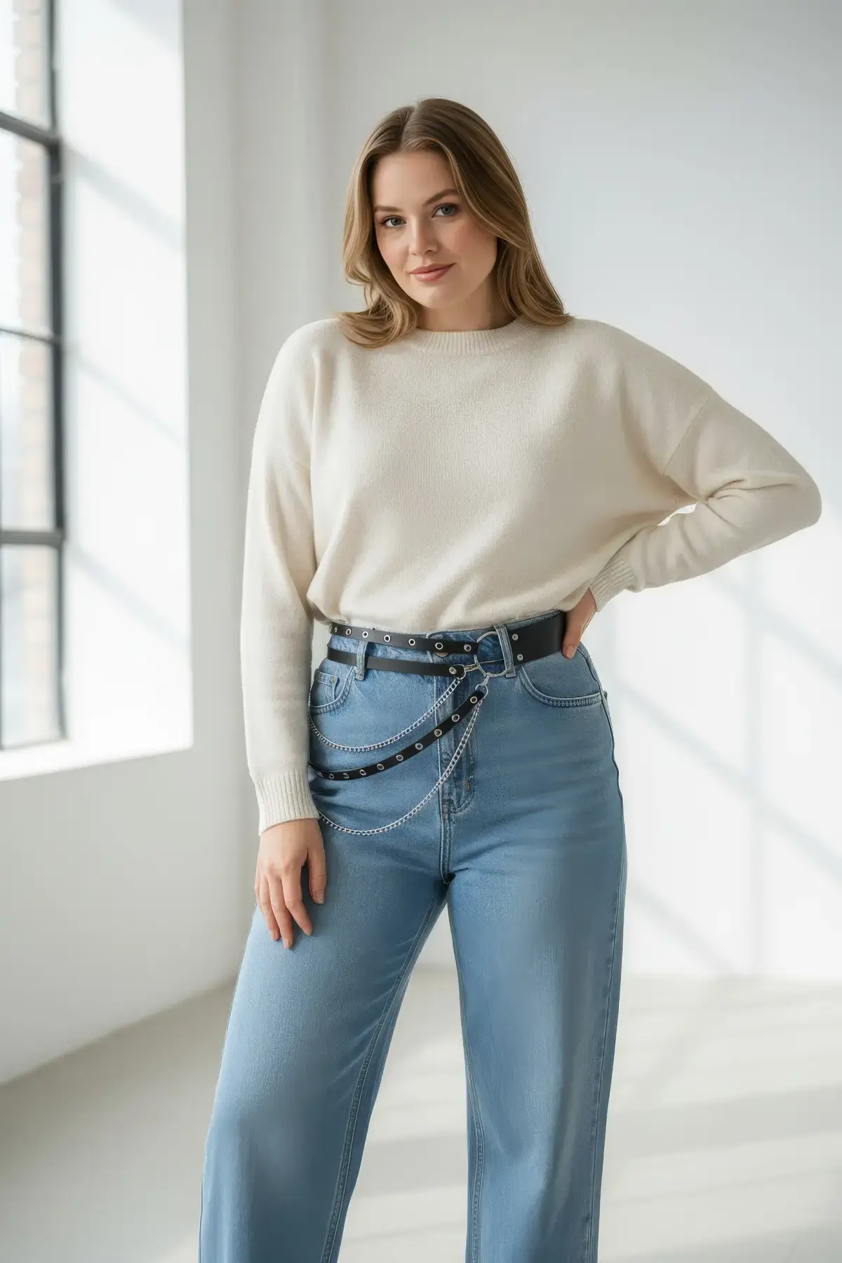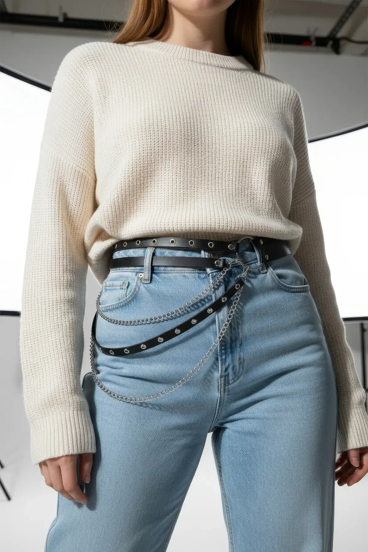 Büyük Beden Siyah Kadın Kemer Zincir Detaylı Çift Sıra Halkalı Kombin Kemeri - APFT586