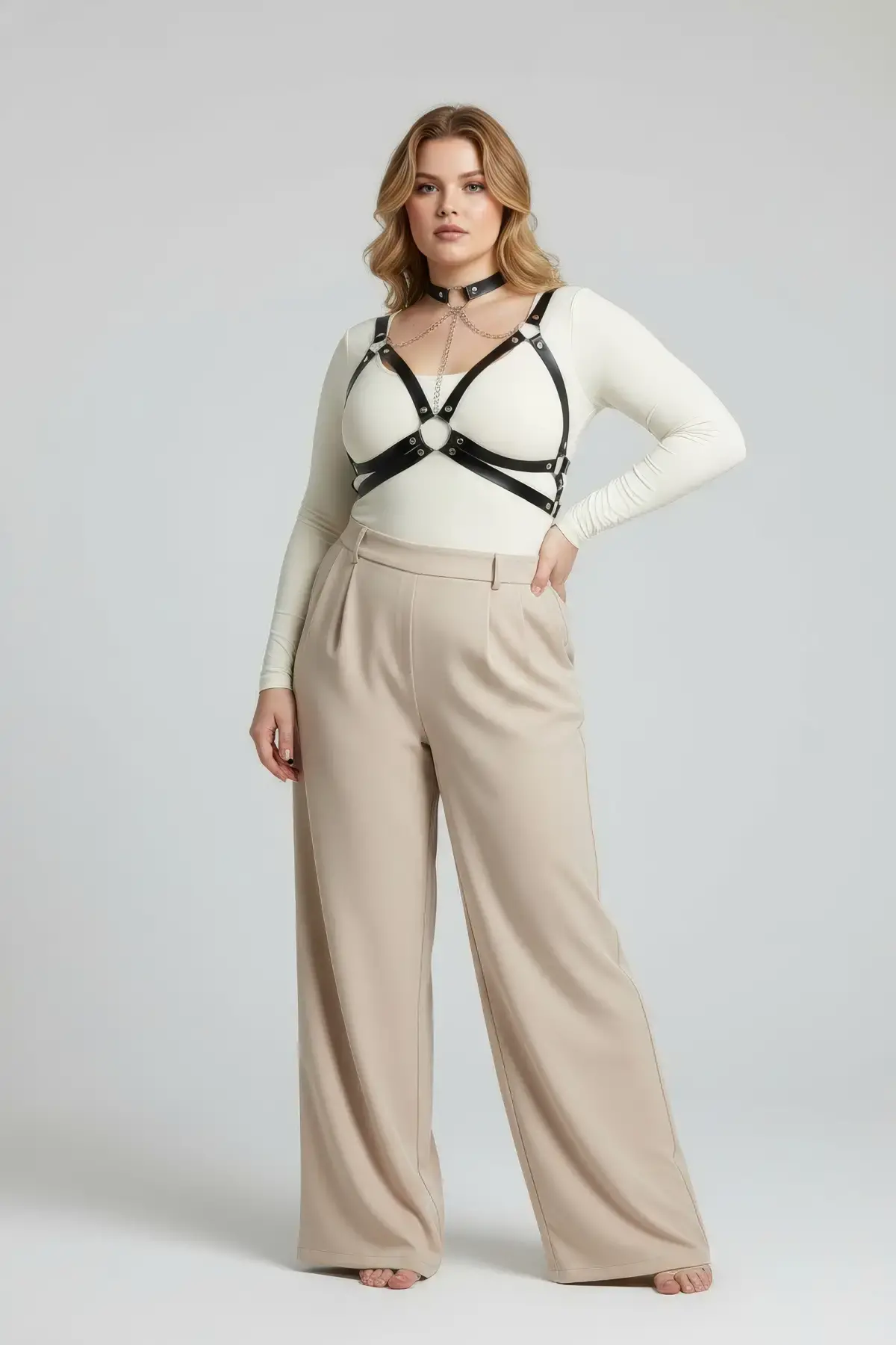 Büyük Beden Haki Kadın Kemer Deri Harness Zincir Detaylı Vücut Aksesuarı - APFT1265