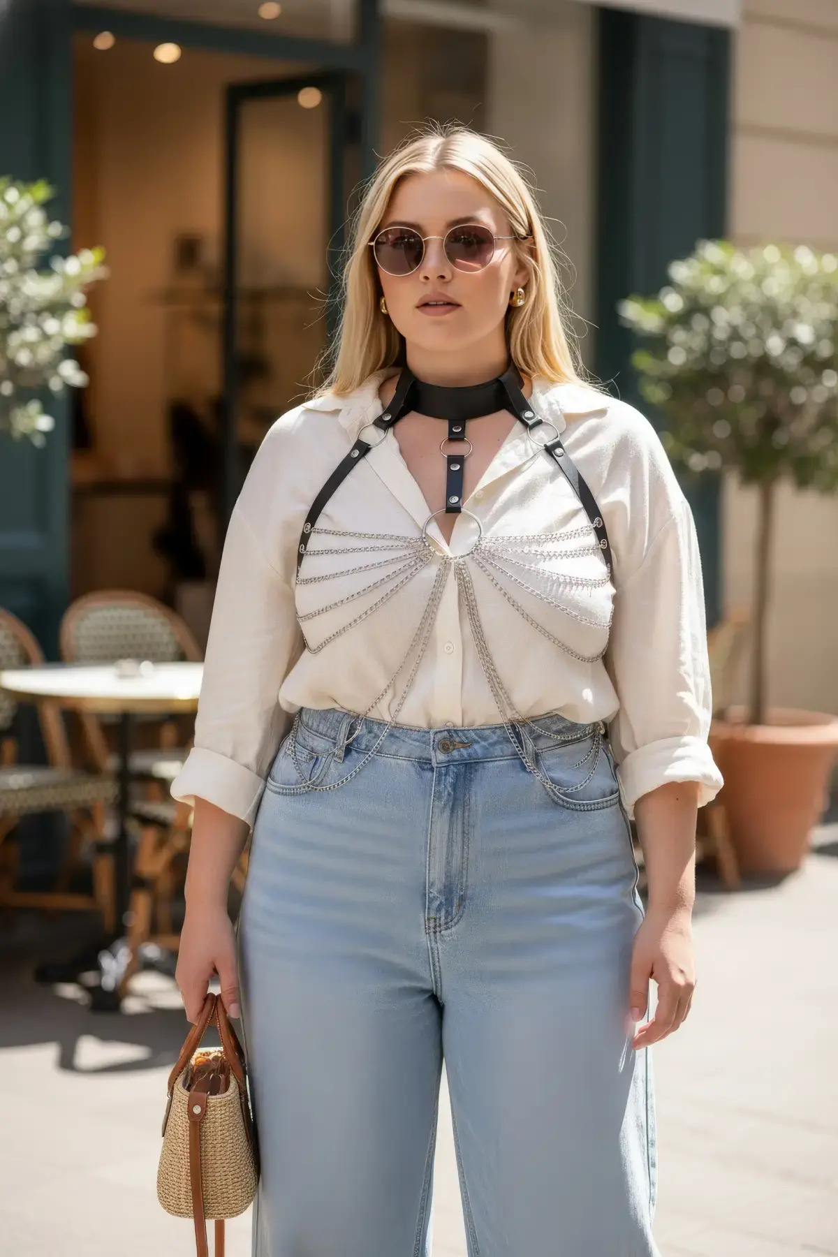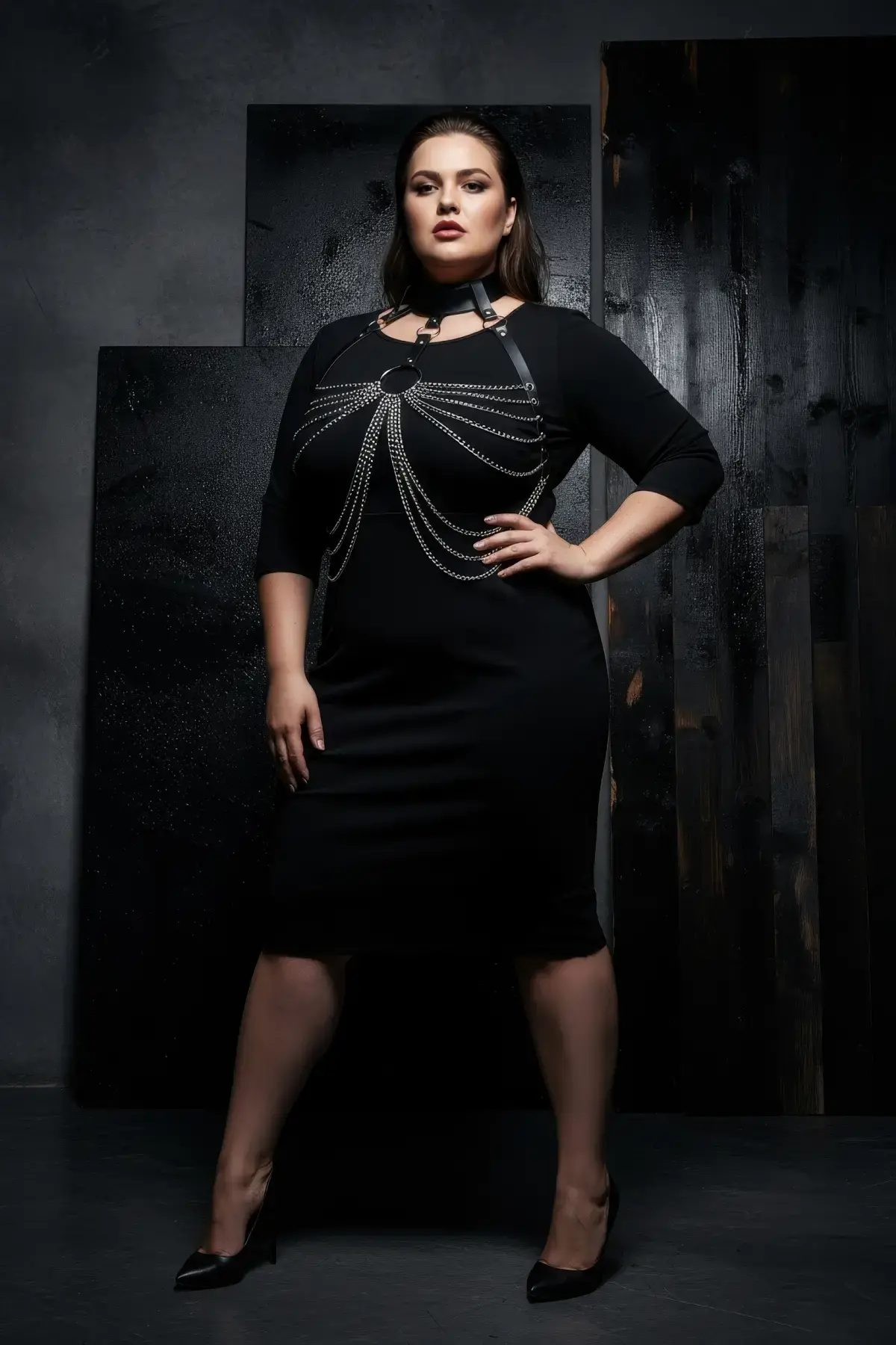 Büyük Beden Siyah Kadın Kemer Zincir Detaylı Deri Harness Vücut Aksesuarı - APFT401
