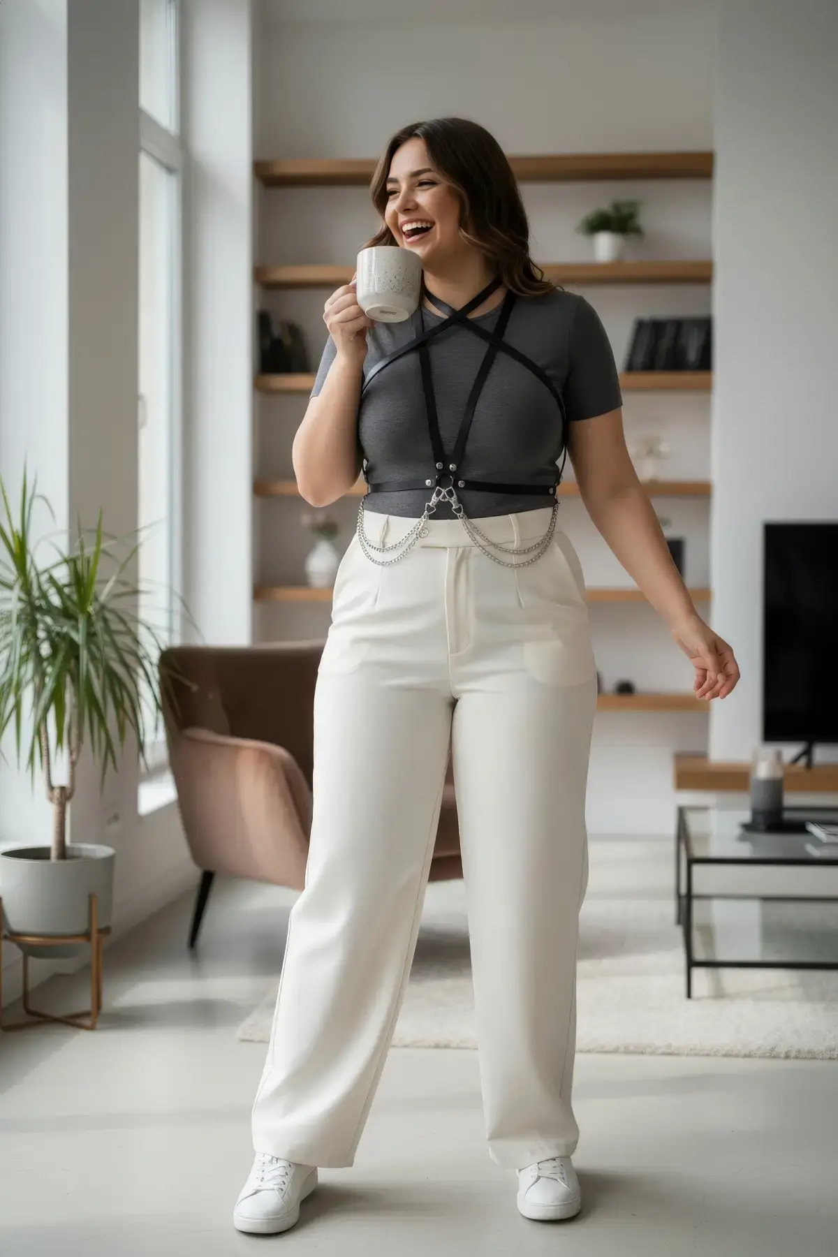 Büyük Beden Siyah Kadın Kemer Zincir Detaylı Deri Vücut Aksesuarı - APFT52