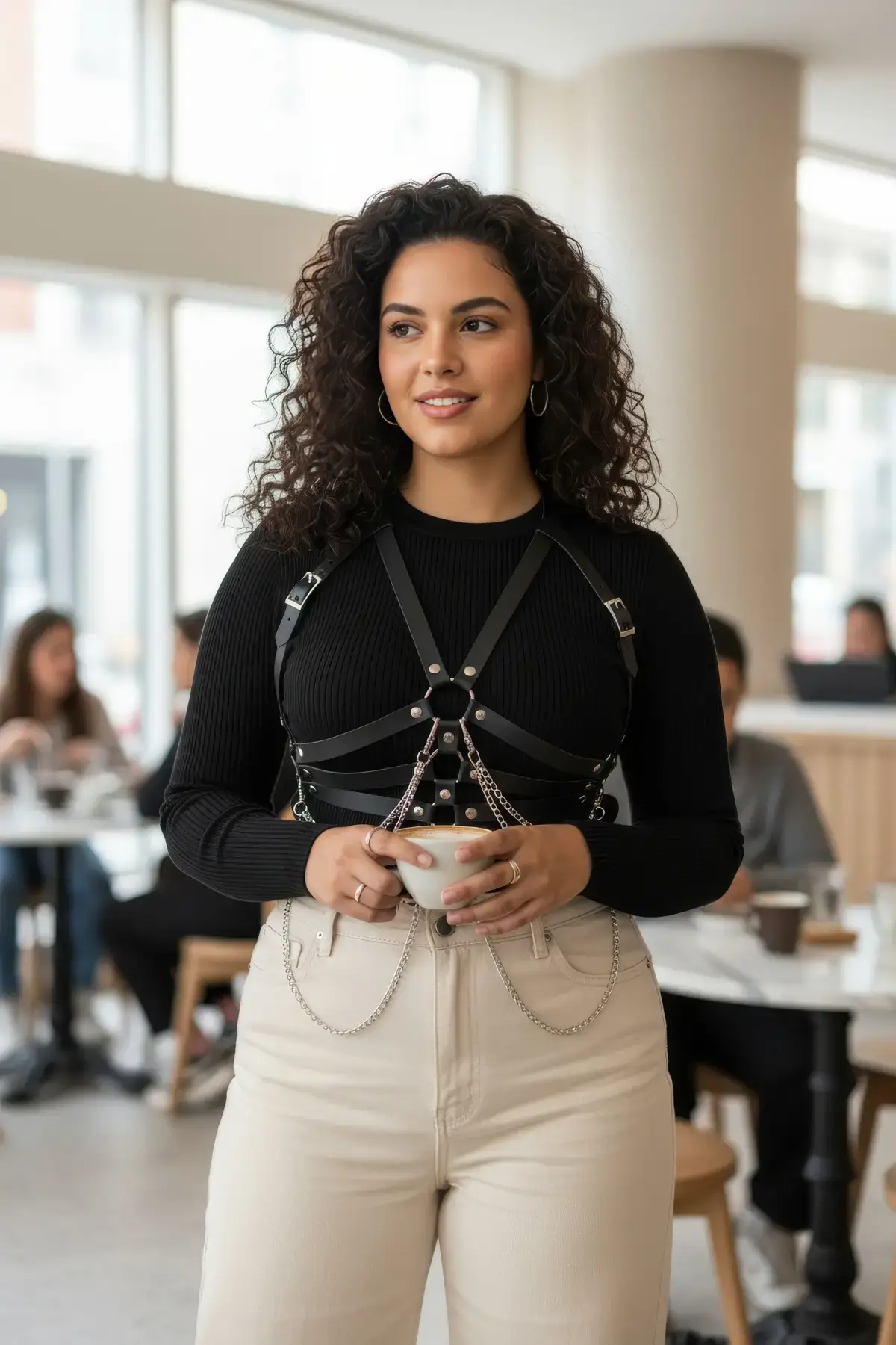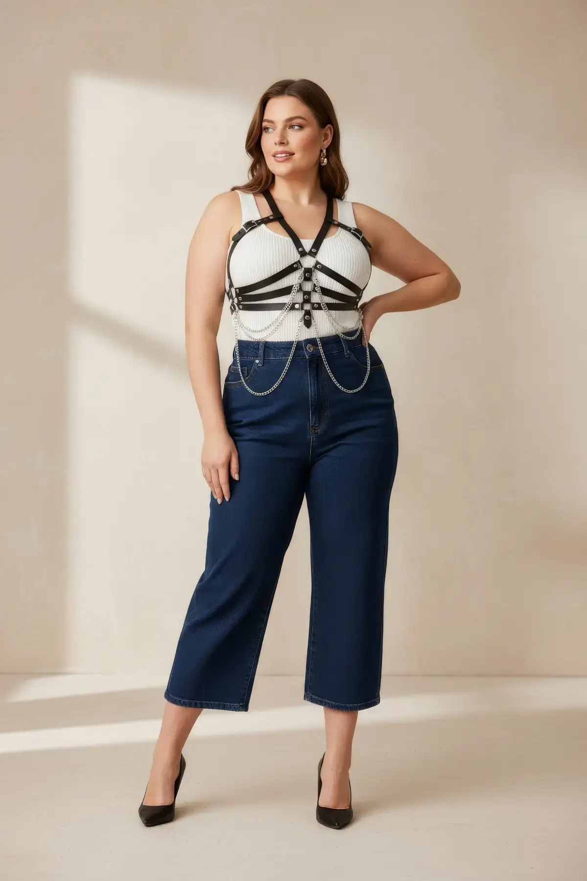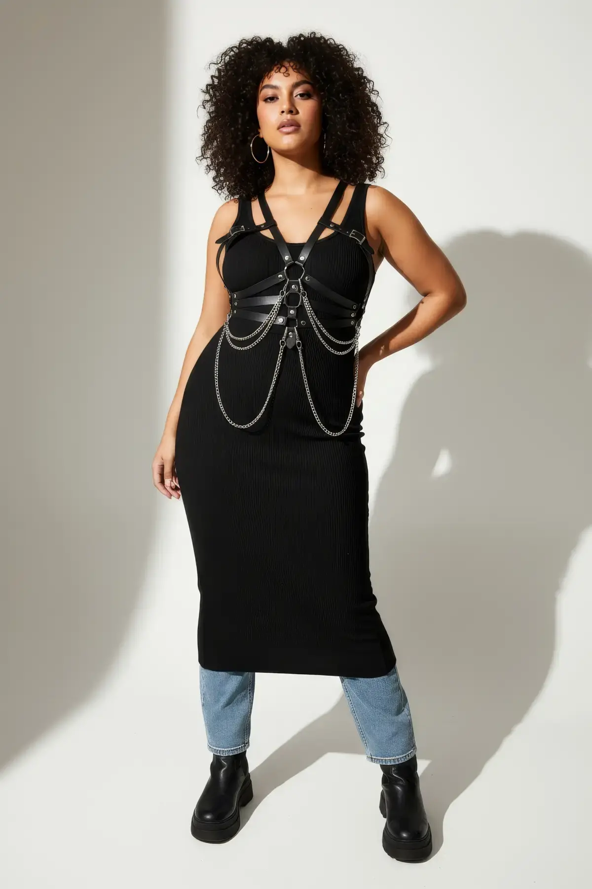 Büyük Beden Siyah Kadın Kemer Zincir Detaylı Korse Tarzı Vücut Aksesuarı - APFT9