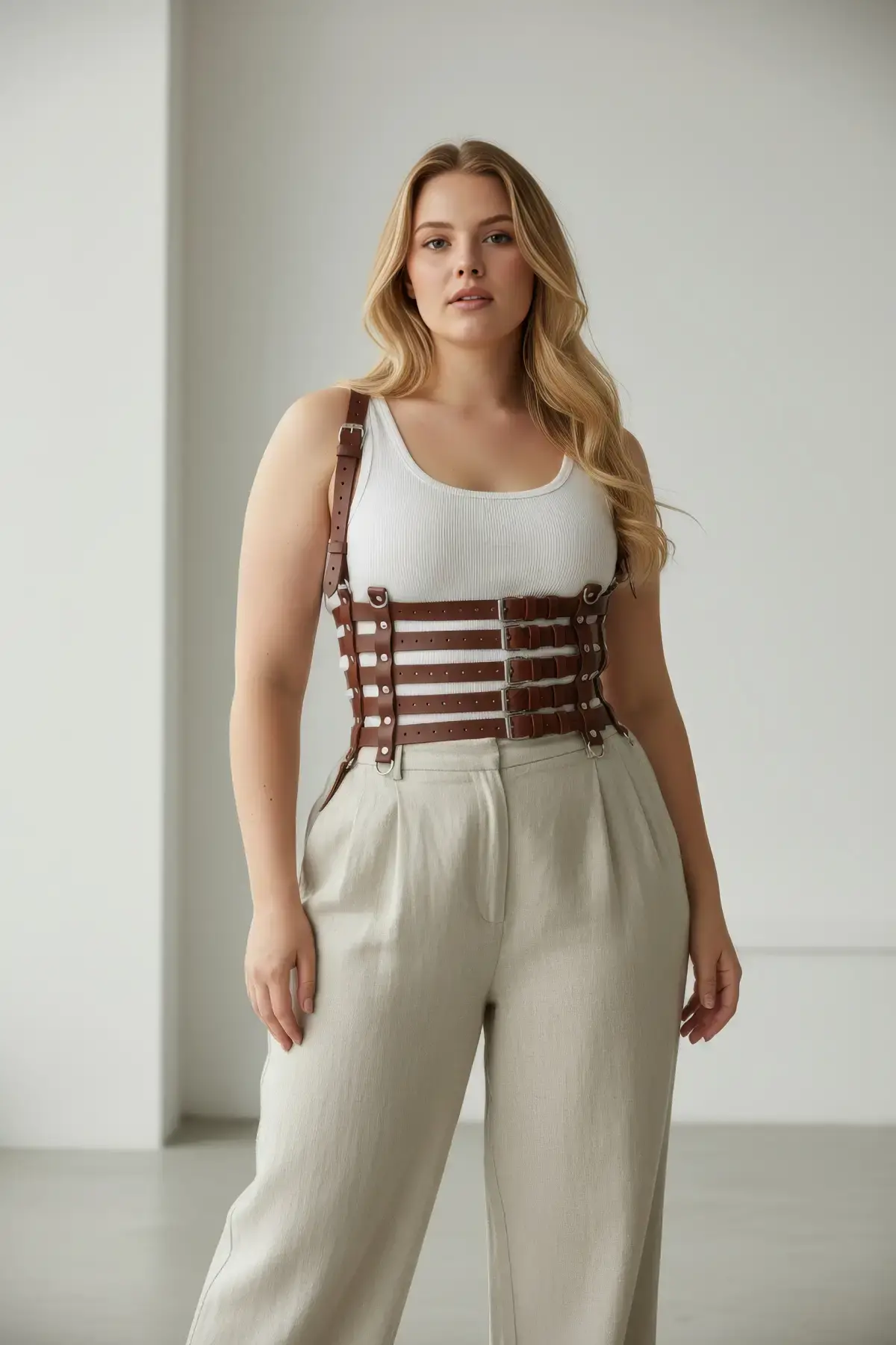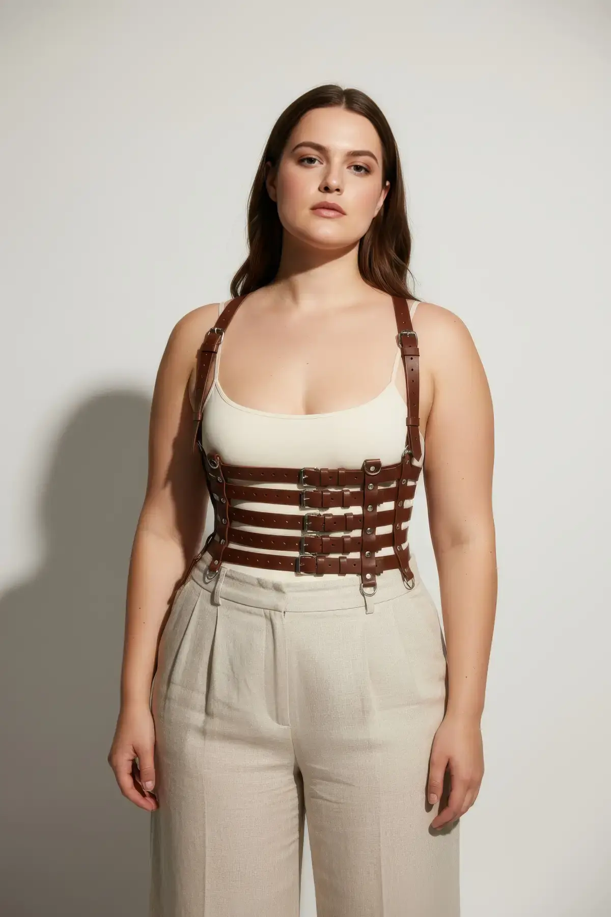 Büyük Beden Taba Kadın Kemer, Korsaj Stil Çoklu Kayışlı Deri Kombin Tamamlayıcı - APFT630