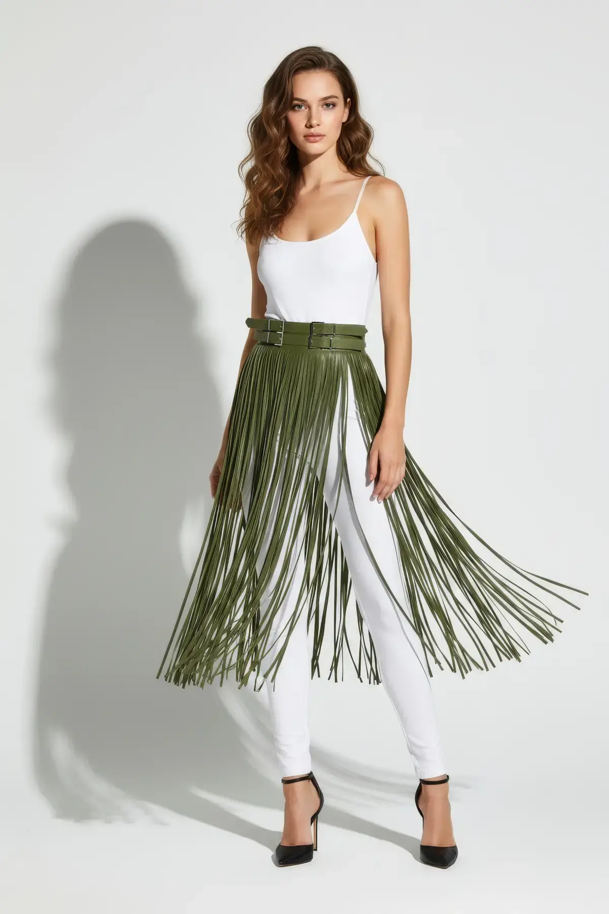 Haki Etek Uzun Püskül Detaylı Etek Suni Deri Etek Yüksek Bel Etek - APFT1090