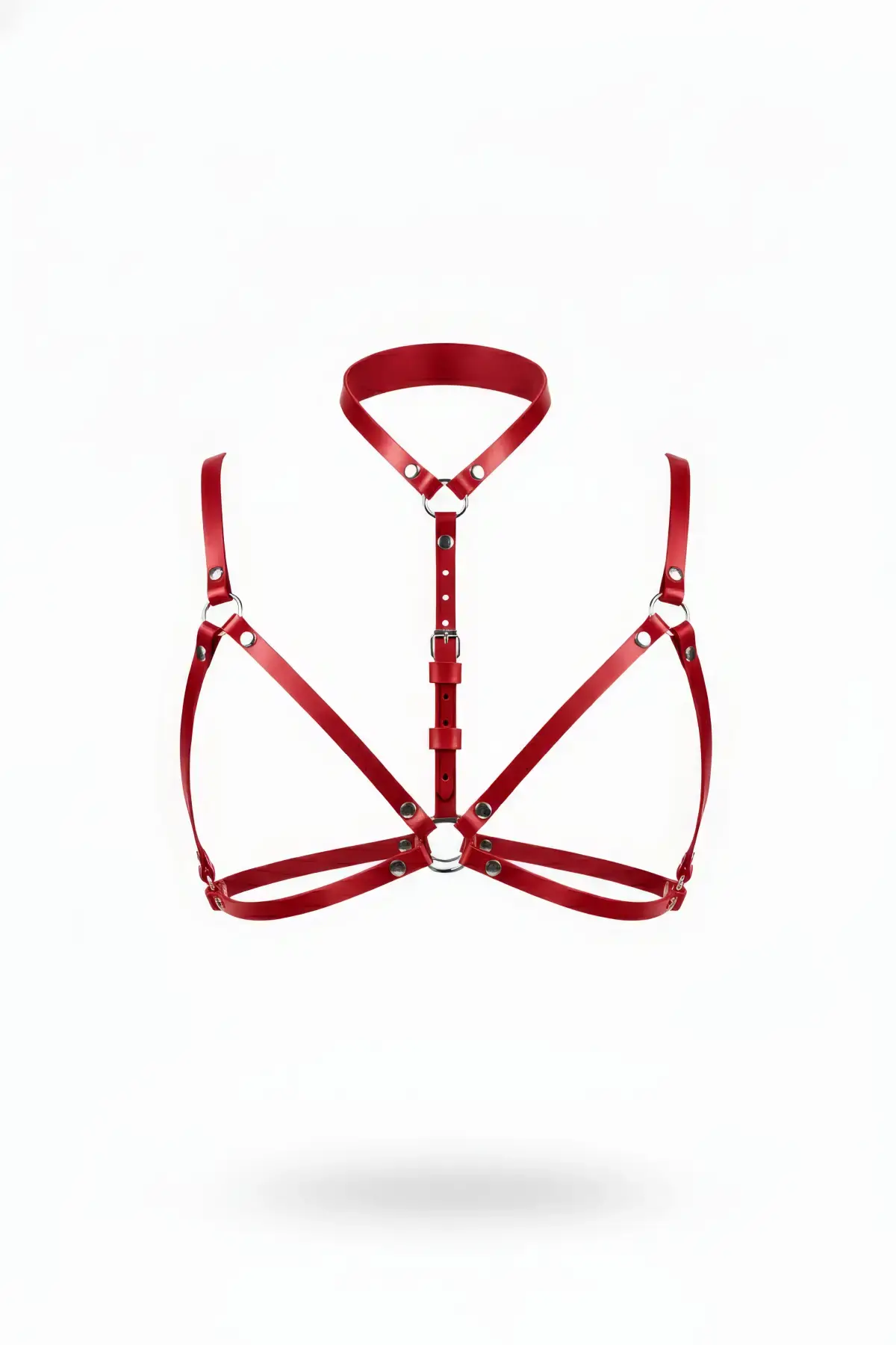 Kırmızı Göğüs Harness Deri Boyunluklu O Halka Detaylı - APFT197