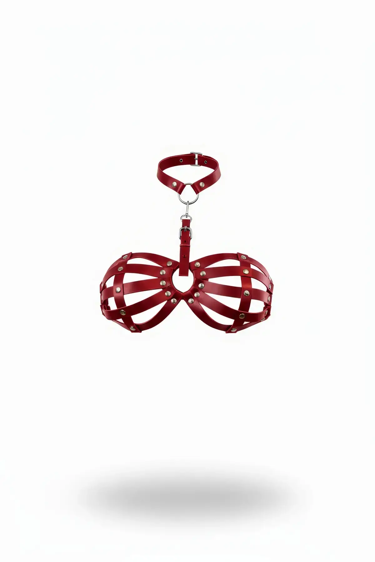 Kırmızı Göğüs Harness Deri Kafesli Zımba Detaylı Boyunluk - APFT224
