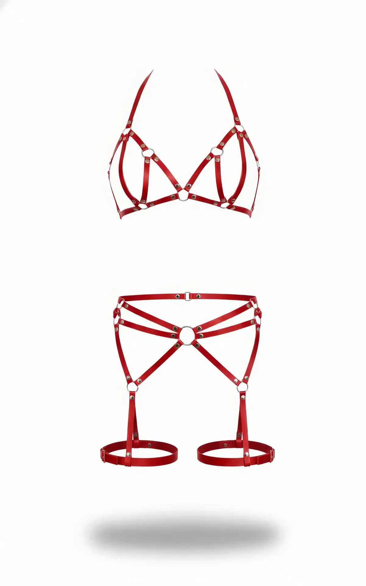 Kırmızı Harness Takım Metal Halka Detaylı Bralet Jartiyer Seti - APFT547
