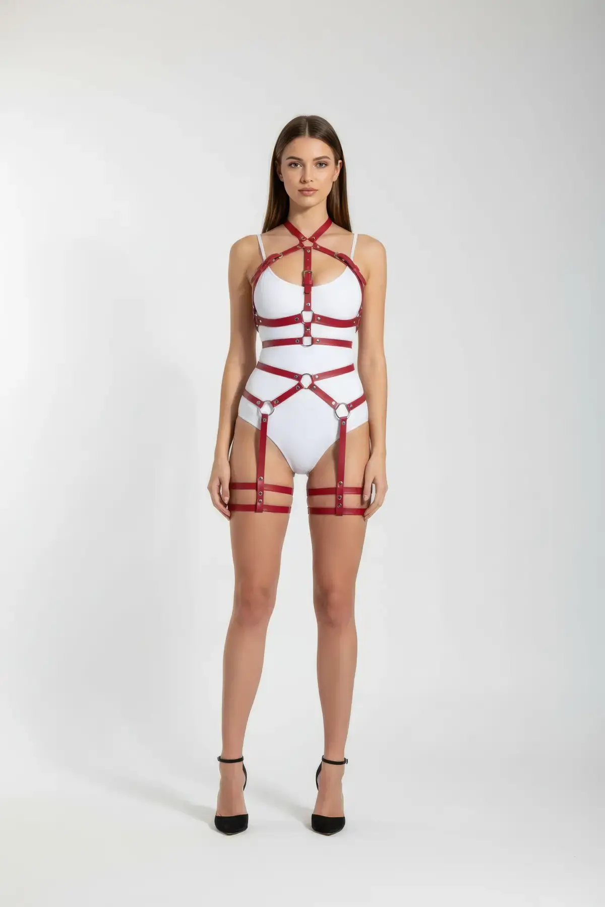 Kırmızı Harness Takım Vücut Bandajlı Metal Halka Detaylı - APFT598
