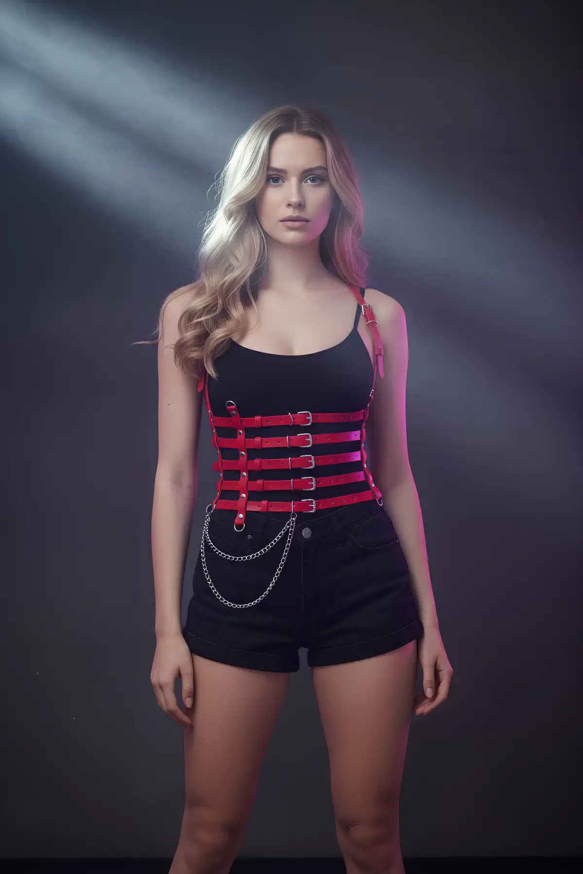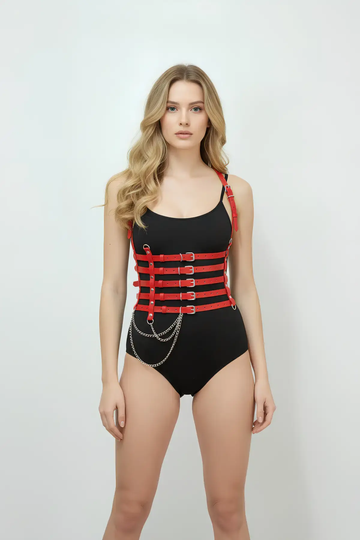 Kırmızı Göğüs Harness Zincir Detaylı Deri Aksesuar - APFT964