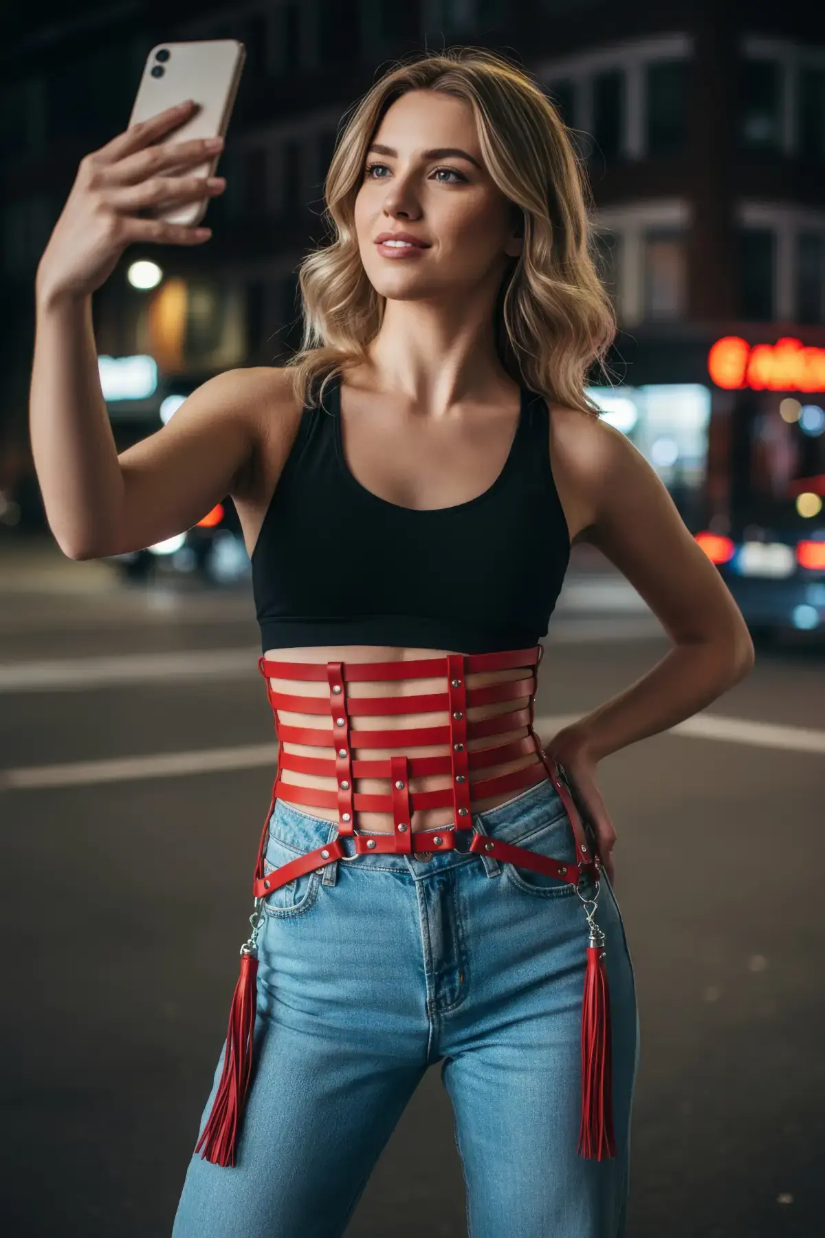 Kırmızı Kadın Kemer Geniş Korse Detaylı Deri Kemer - APFT408