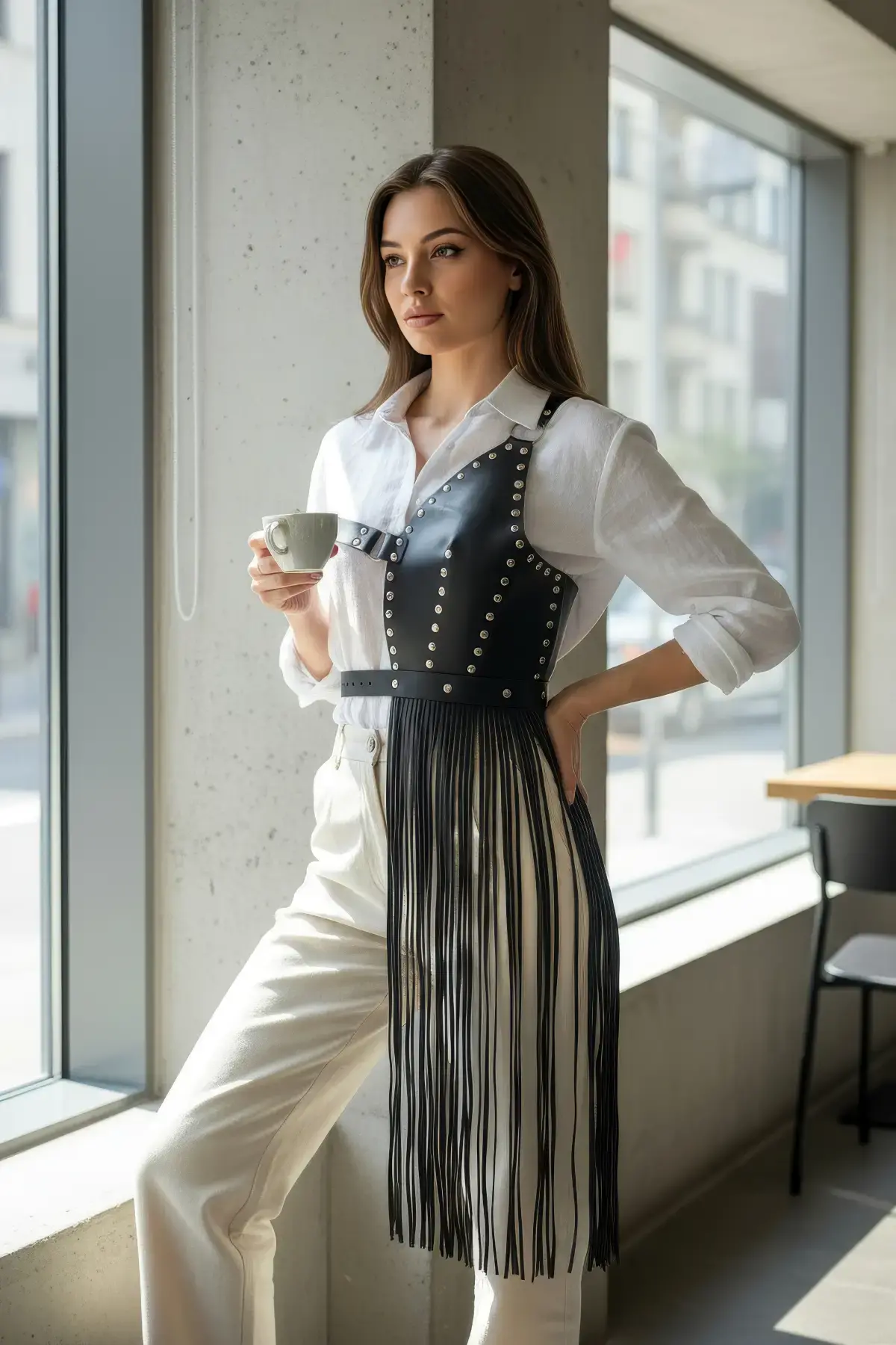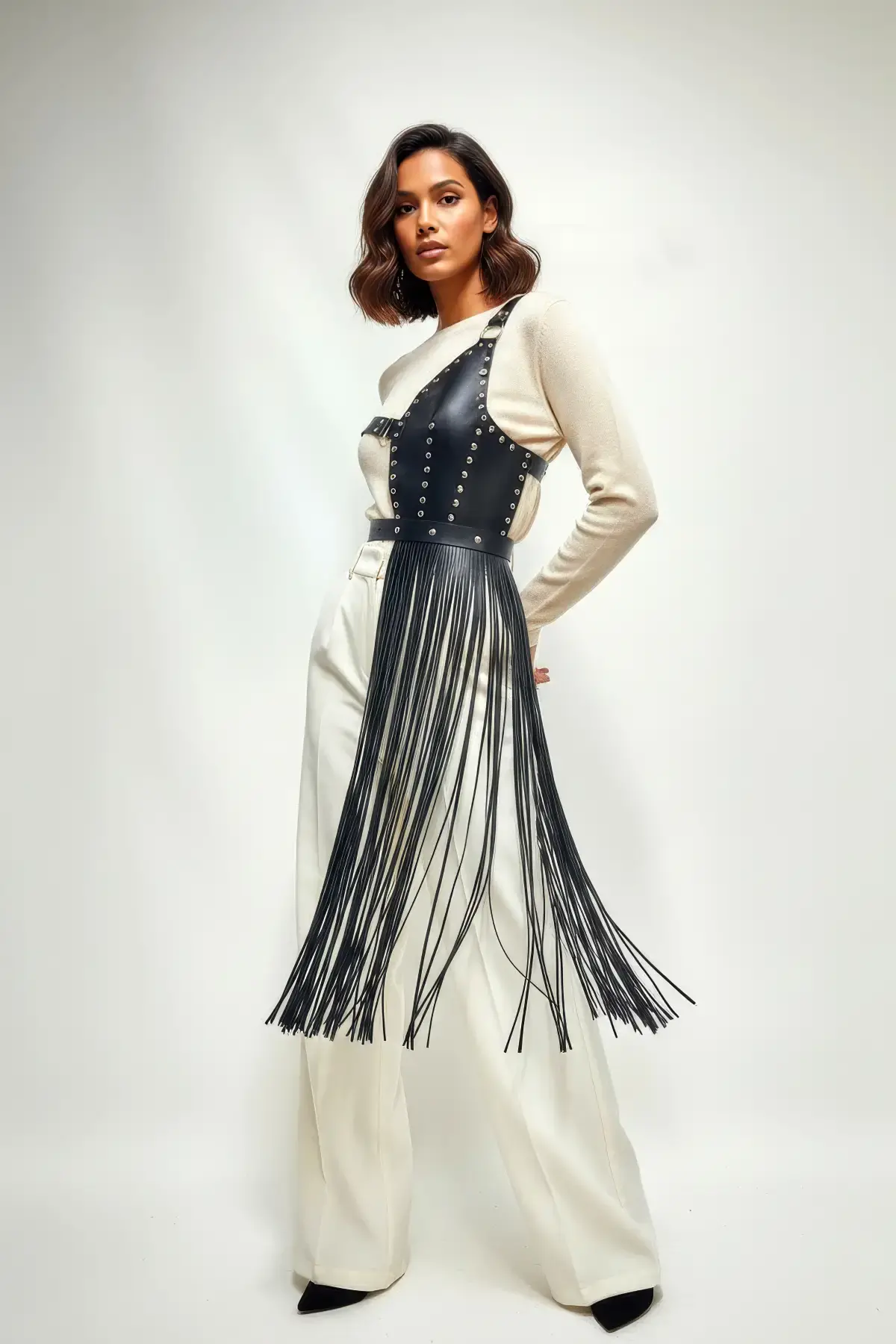 Siyah Etek Deri Zımbalı Asimetrik Püsküllü - APFT1014