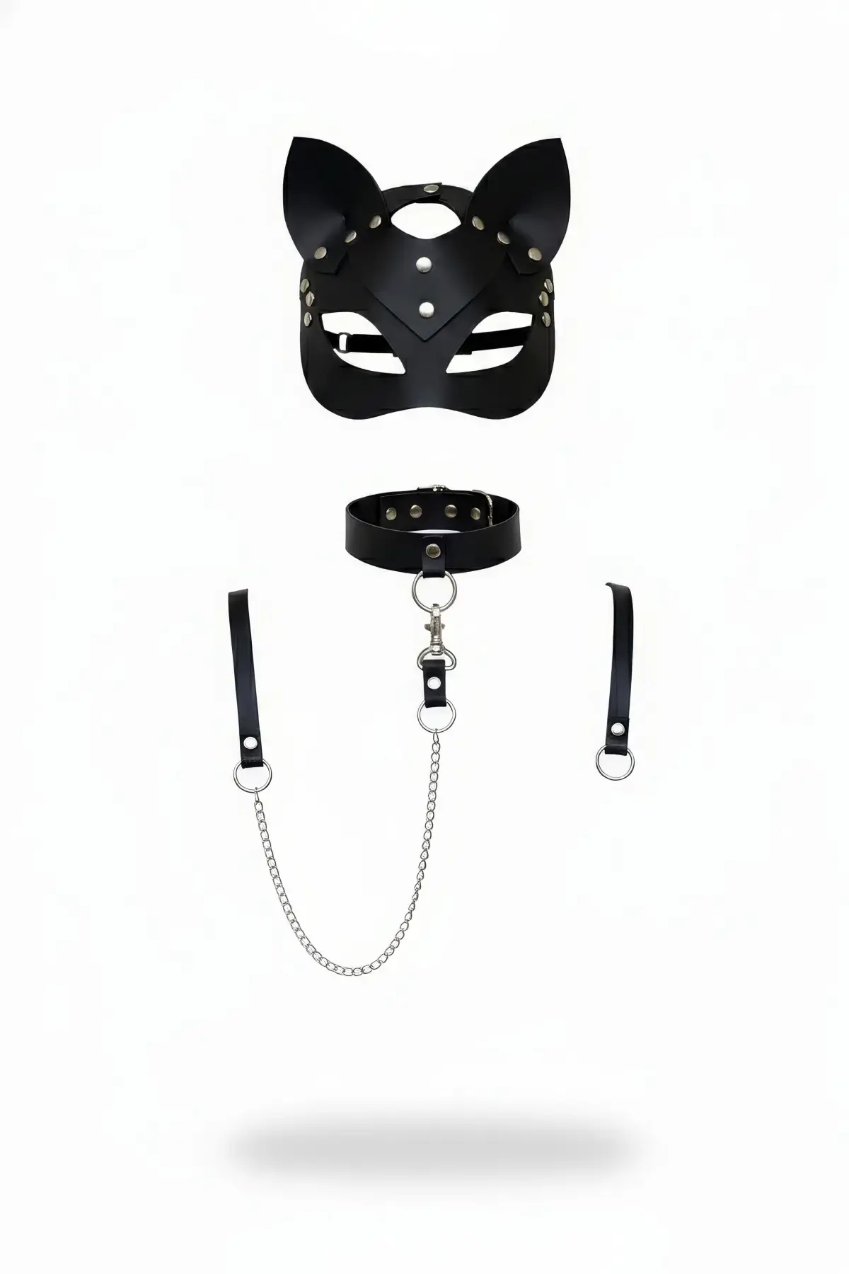 Siyah Harness Takım Kedi Maskeli Zincir Detaylı - APFT784