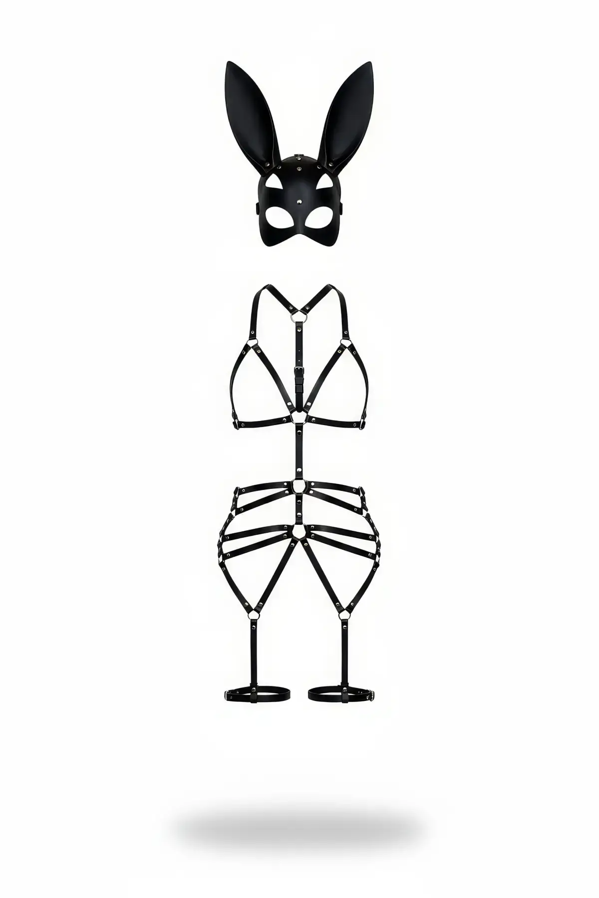 Siyah Harness Takım Tam Vücut Tavşan Maskeli Deri Detaylı - APFT121