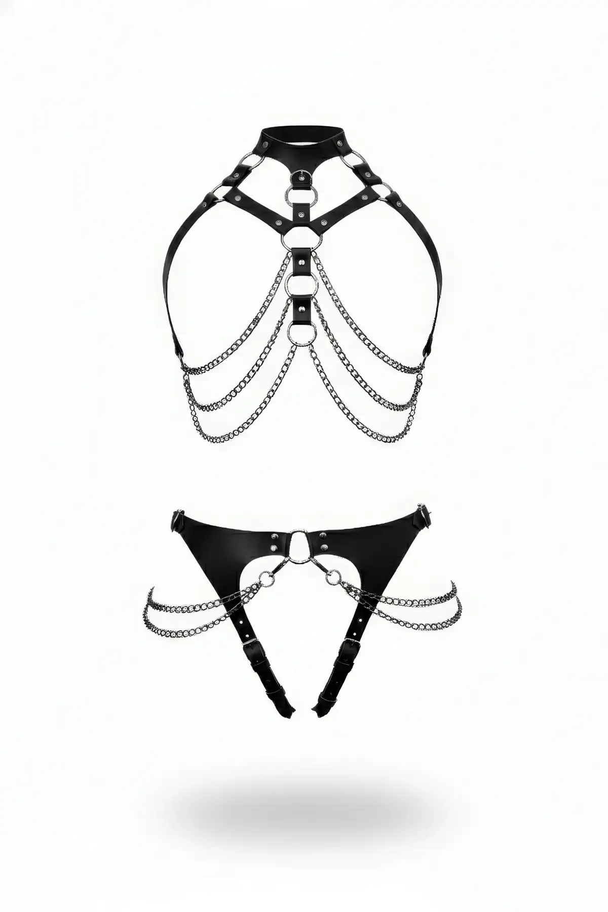 Siyah Harness Takım Zincir Detaylı Deri Vücut Kemerleri - APFT1330