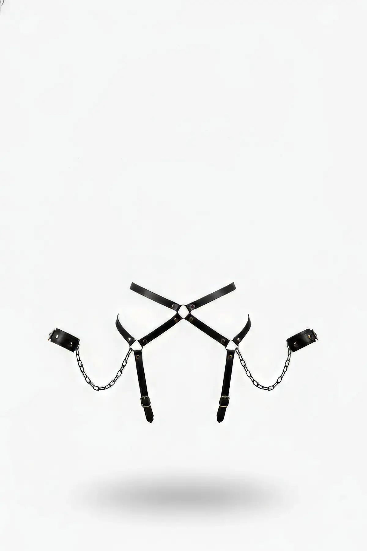 Siyah Harness Takım Zincir Detaylı Kelepçeli Vücut Aksesuarı - APFT708