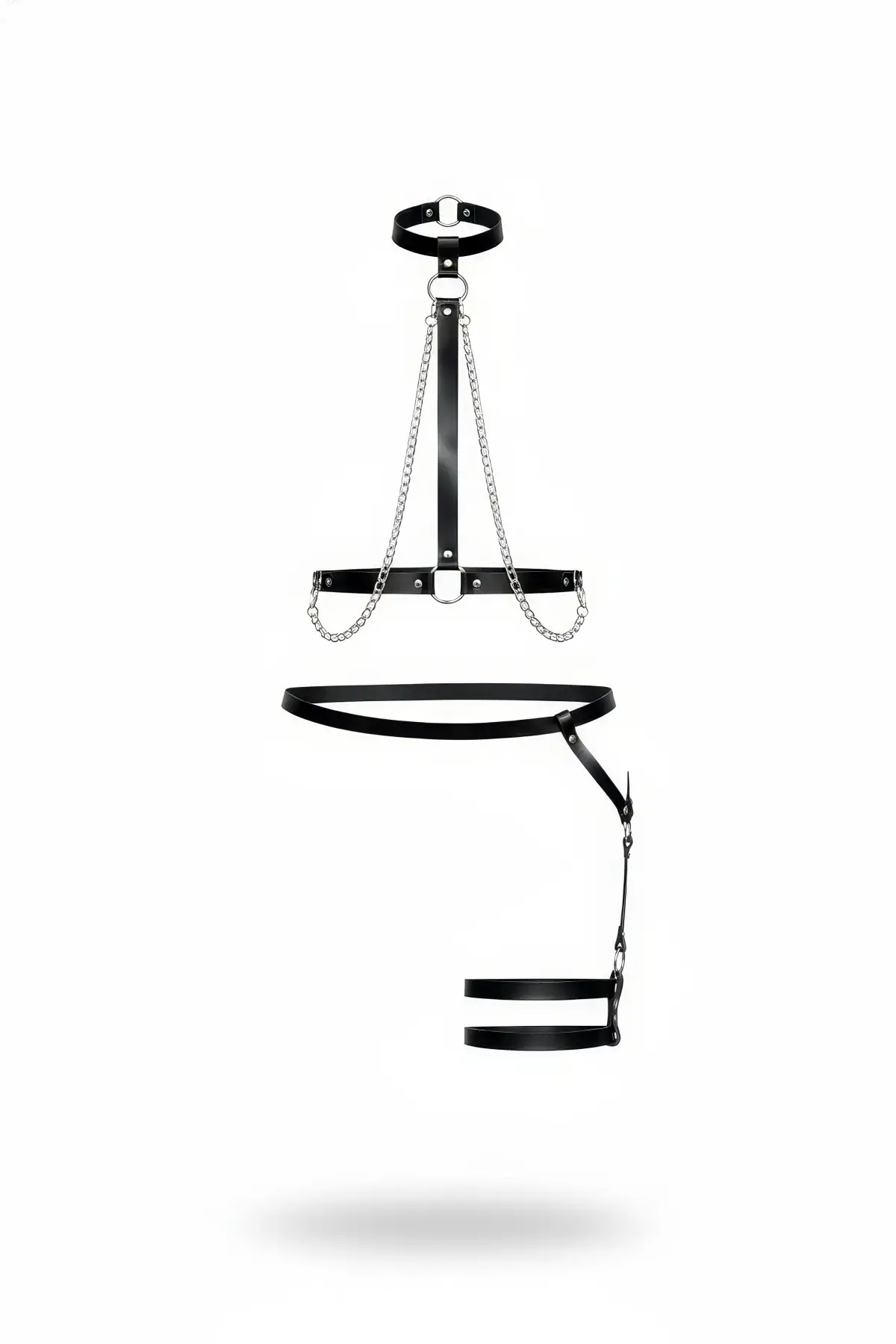 Siyah Harness Takım Zincir Detaylı Deri Yüksek Yaka Jartiyer Seti - APFT486