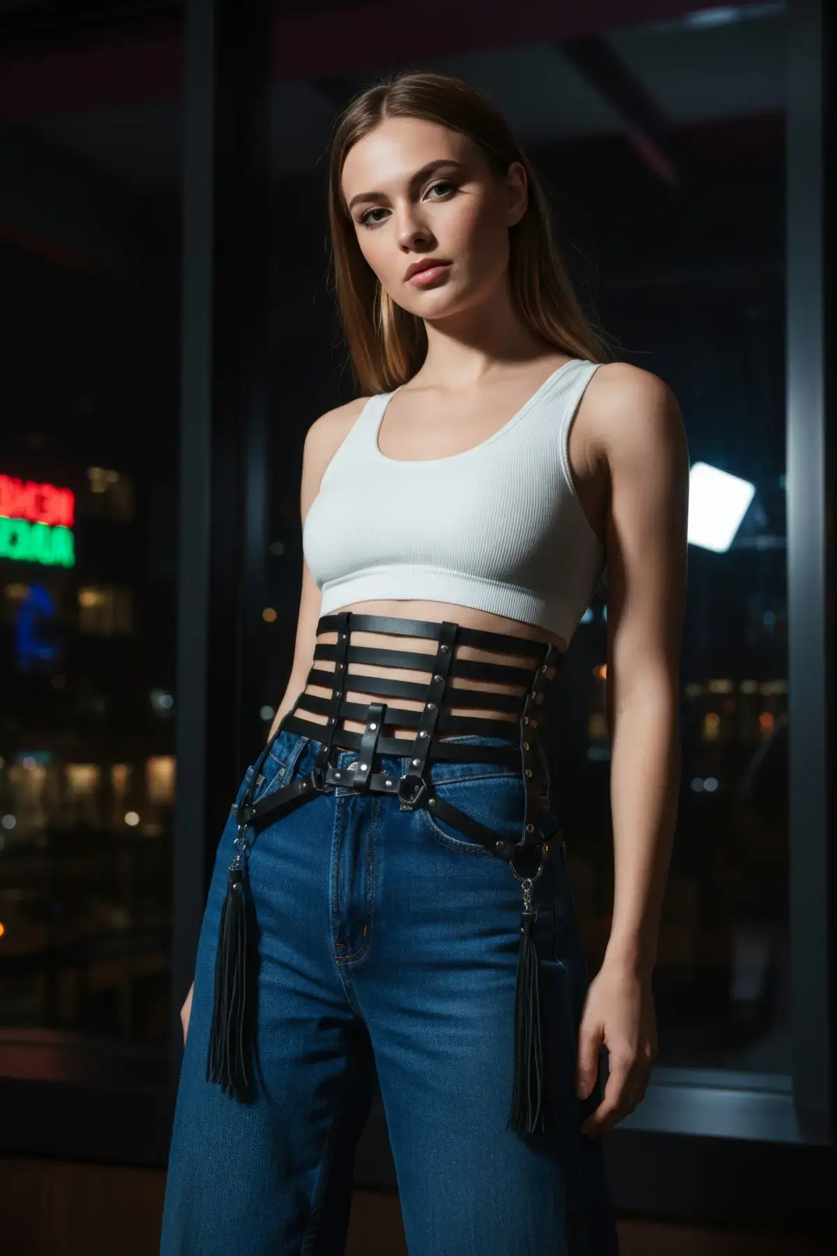 Siyah Kadın Kemer Suni Deri Halka Detaylı Vücut Aksesuarı - APFT200