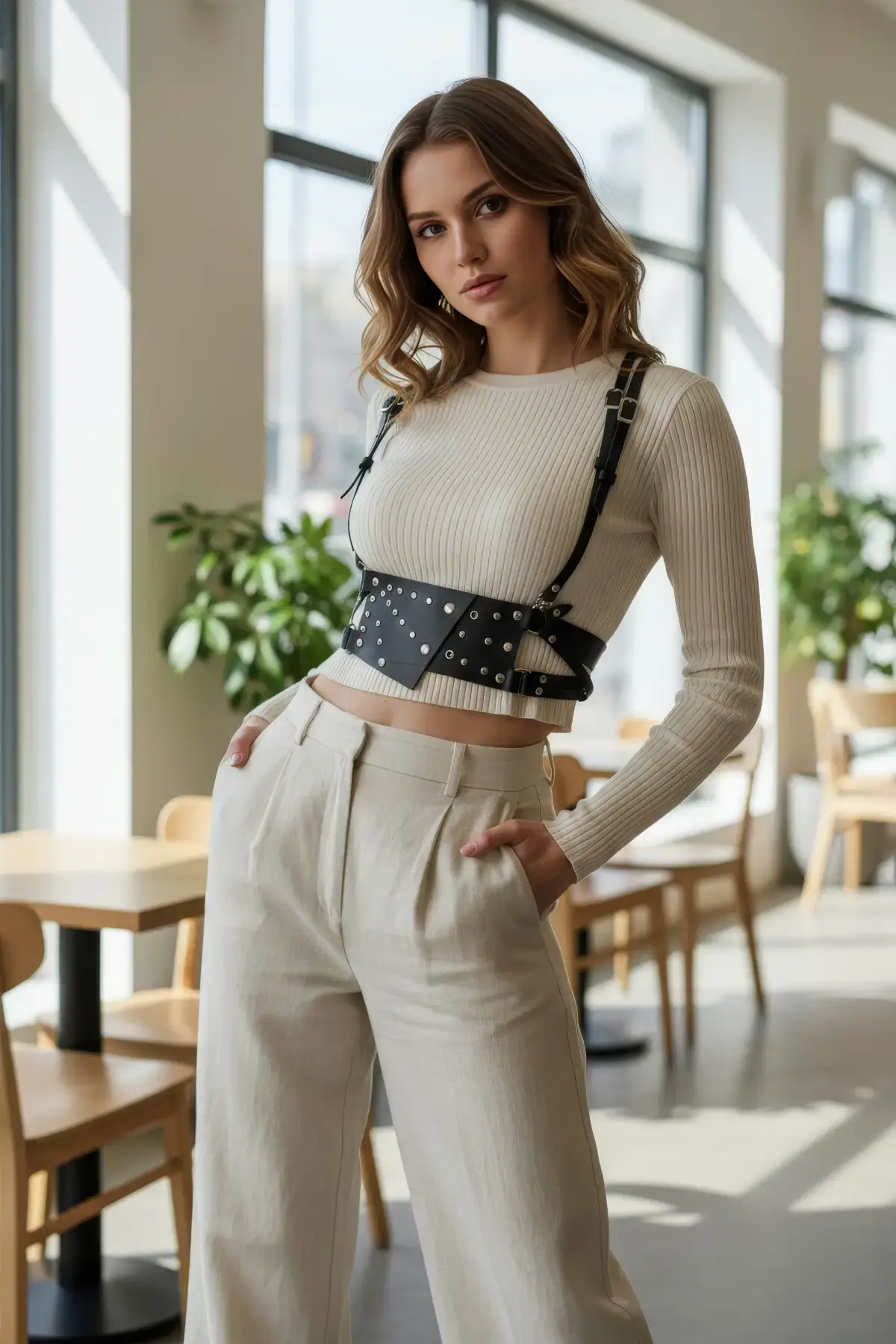 Siyah Harness Takım Zımbalı Deri Bralet Detaylı - APFT849