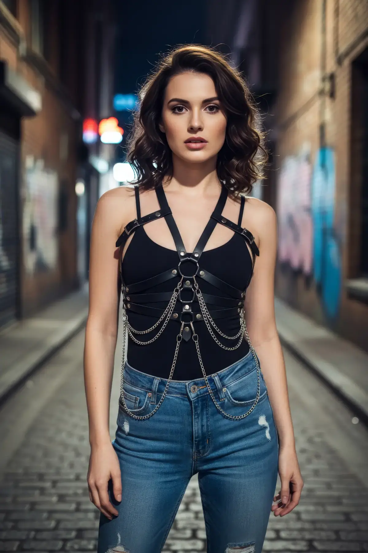 Siyah Kadın Kemer Deri Zincir Detaylı Vücut Aksesuarı - APFT438